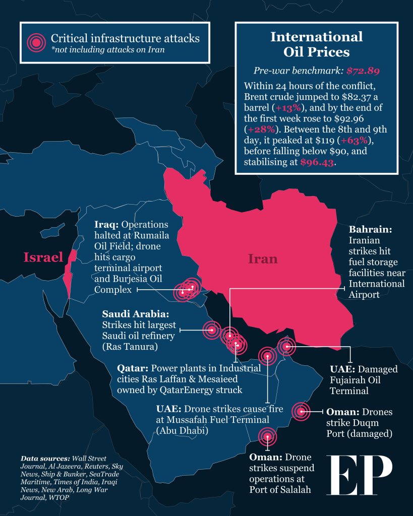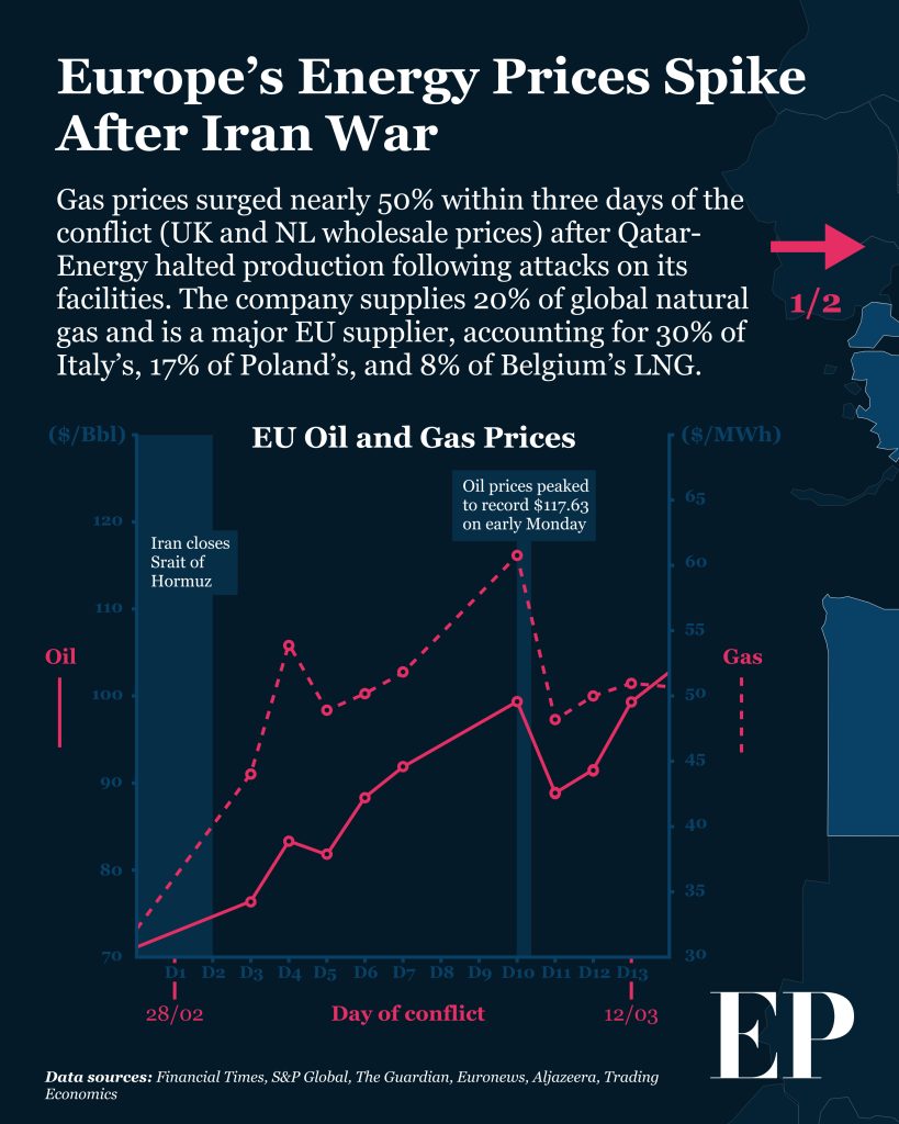 Beyond the military dimension, the conflict has begun producing serious economic repercussions. Repeated Iranian threats to close the Strait of Hormuz—through which roughly 20% of global oil and gas supply passes—have destabilised global energy markets. As a result: European gas prices have risen nearly 50%, energy markets remain volatile, concerns are growing about long-term supply disruptions. While the EU maintains emergency energy reserves, the prospect of a prolonged crisis raises difficult questions about Europe’s energy security and economic resilience.